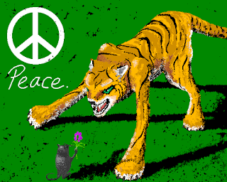 The tablet is still amazing fun to use, and moving a pen is incredibly much faster and smoother than moving a computer mouse with your entire arm. This may affect the results: I ended up using a drawing tool other than pen/airbrush only for the peace symbol, everything else you see in the final result is hand and finger movement. (Ok, maybe the tiger's eye was flooded.)