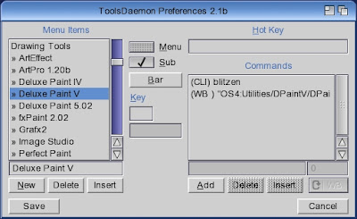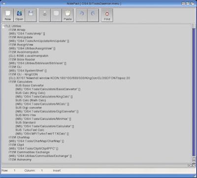 Why is that useful, you wonder? Well, suppose I decide to change all my games that are under my Action Games submenu to split them into numerous groups (which I recently had to do because I have so many AmigaOne action games now!) to that instead of having one Games/Action menu I now have two, Action A-P and Action Q-Z. Using an editor like notepad or TurboText, I can easily manipulate the ascii text menu preferences to move everything around where I wish. When I save it and restart ToolsDaemon, as long as I have kept my formatting correct, my menus will all be updated per my changes to the ascii file.