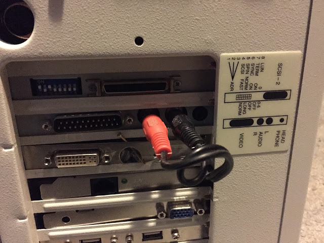 The A4000T uses multiple module cards for all the I/O ports, rather than being included on the main motherboard, as they are on other Amiga's. In the next shot you can see the SCSI external connector (with DIP switches for the SCSI settings so you don't need to open the case to adjust them).
