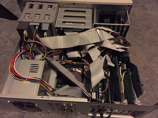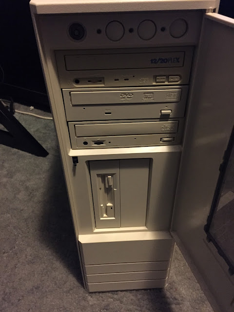 Opening the front cover, I have a DVDROM IDE drive, and 2 SCSI CDROM drives, and just the one high density floppy disk drive, as the IDE hard disk occupies the other blanked slot - it means all the bays are full: