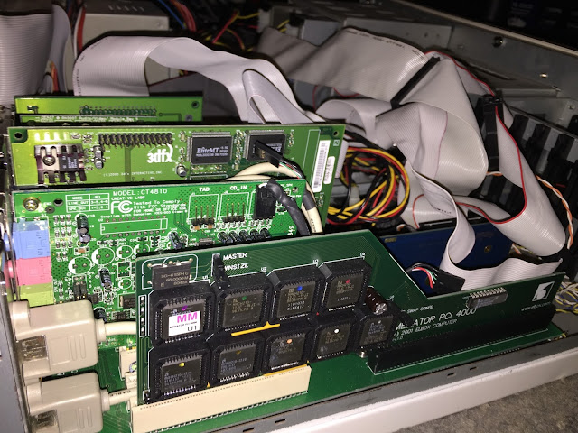 Below that is the Indivision AGA MK2 DVI out (for native Amiga output graphics), Audio/Video module card with RGB port (not used) native Amiga RCA audio out - which is fed back into the case to be mixed via AUX IN into the PCI sound card output. The PCI sound card has a DSP that can decode MP3's in hardware, meaning the 060 is not needed to playback MP3's! :-)
