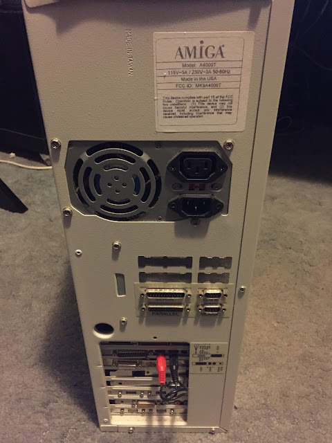 Rear view of the A4000T - the case is big, bulky and heavy. A typical PC AT high tower case of that era. Not as bad as a A3000T from what I have been told - never owned or tried to lift an A3000T. The back says Made in Taiwan and the label says Made in the USA...