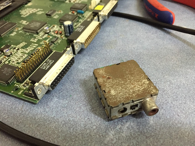 The other solution comes in the form of other people's A600 upgrades I found on the internet, which involve desoldering the RF modulator from the Amiga 600 motherboard, and replacing it with the VGA out port from the Indivision ECS, which apparently fits perfectly in the A600's RF out port hole at the back.