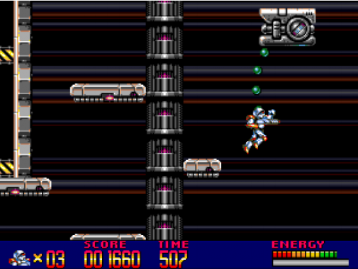 The power lines from the first two games are present again although this time they emanate from the player in a series of concentric circles, widening out until they disappear off screen. The lifesaving gyro mode from the earlier games is also back. Pressing down and holding the fire button for a second will activate gyro mode (this is admittedly a little more convenient than Turrican 2’s downand-spacebar method, which was always a bit tricky to accomplish, especially when under pressure). This time around, there’s a limit imposed on the amount of time you can spend in gyroscope mode. On entering gyro mode, a bar underneath your energy level begins to decrease. Once the bar runs out, you’re immediately changed back to standard suit mode. As an extra challenge, the game makes you wait a short while before you can enter gyro mode again. The biggest change to Turrican’s arsenal of weapons however is the omission of the deadly 360- degree laser weapon. It’s been replaced with… a rope. That’s right, instead of the ability to swirl laser death around your head at incoming enemies, you can now throw a rope at them and run in the opposite direction. I’m being a bit unfair here of course. The rope isn’t intended as a weapon but as a way of reaching inaccessible parts of the screen. You’ll often see bonuses such as energy upgrades or even extra lives floating temptingly in hard-to-reach areas, so you’ll need the rope to reach them. Using the rope is simple enough, though it takes a bit of practice. Holding down the fire button will shoot the rope in whatever direction the gun is aiming (you can shoot it ahead or diagonally). If you’re aiming at something which can be latched on to, the rope will connect to it and the player can ascend to a previously unreachable part of the screen by pushing up on the joystick. They can also lower themselves back down.