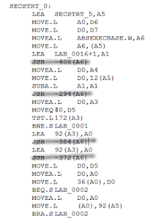 Next thing that is a issue is to understand what the code does, there are some clues, see the lines that starts whit JSR, JSR is short for Jump To Sub Routine. In front of A6 (address register 6), you have a negative value, this is a offset value we call LVO, A6 is loaded whit library base address, we just need to find what library and compare the LVO values to that library offsets, LVO number are not unique to one library they can be the same for number of libraries, so we can't just auto replace the values whit consents.