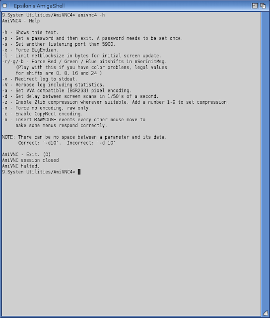 First I ran amivnc4 -h from the Shell to see the available options. There are quite a few: