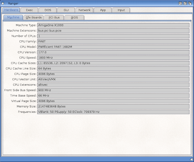 Ranger is included with AmigaOS4.1 and is written by Steven Solie. It provides a very detailed informational view of the internals of the AmigaOne X1000 hardware and also the AmigaOS4.1.6 running system information. (reminds me of System Information program under Windows XP/7)