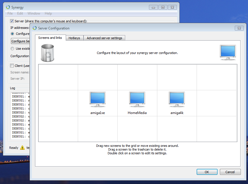 On the "server" you configure a physical relationship between systems. In my case I have my Amiga1XE on the left of my PC and my Amiga4K on the right. I've the Synergy server this configuration so all I need to do is simply move the mouse to the left and it jumps from the Windows system to the Amiga. At one point I had a Mac laptop on the left of my Amiga1XE and was able to keep moving the mouse to the left to jump again. Fun stuff!