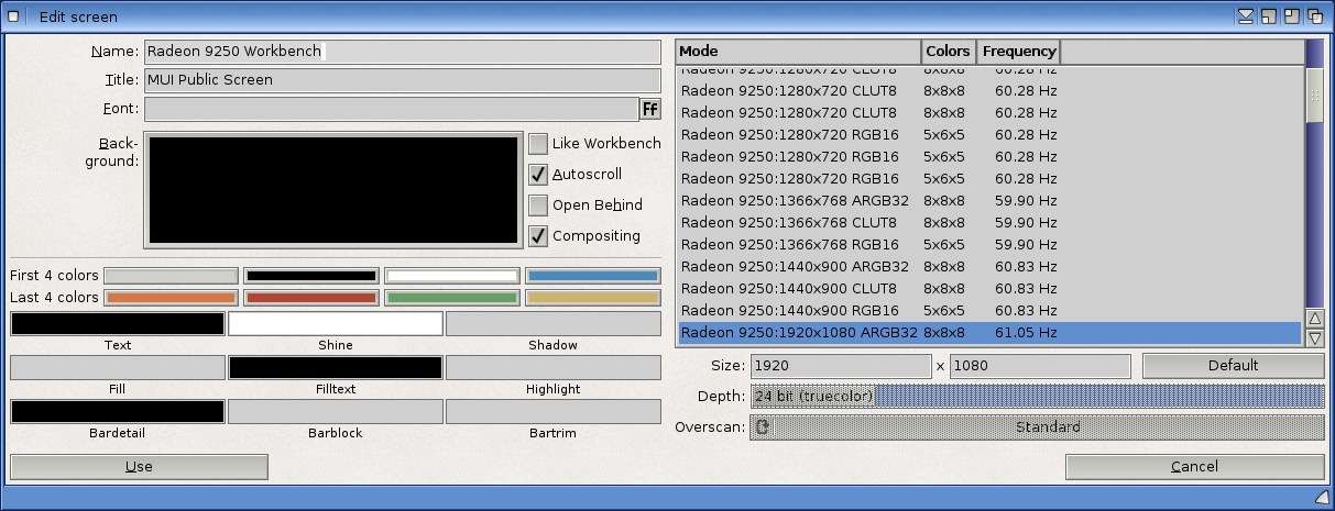 In the settings for the screen, uncheck Like Workbench, and select the other video card's desired screen resolution (Radeon 9250 for me). I hate the default background Workbench grey, so I change this to black by clicking on the Background box (which allows you to choose the colour you want - click to expand pic):