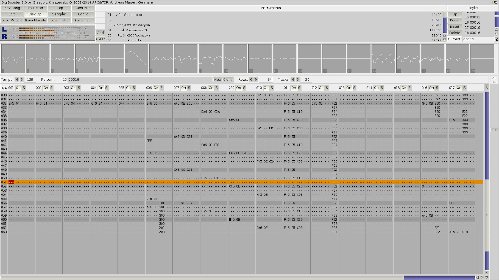 I loaded up the example DigiBooster module by Krashan (who also programmed the DigiBooster 3 program) - the song was called M2, which I downloaded from the DigiBooster website here: