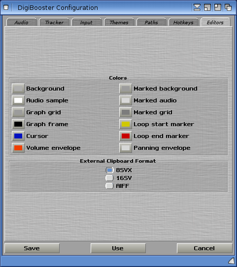 Finally, on the Editors tab you can change the colours used within the editor, and which sound file format the external clipboard uses.