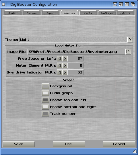 Let's take a look at the other setting tabs of interest in the configuration screen window while we are here. The Theme tab allows you to select themes that change the appearance of the DigiBooster window, the skins used for the level meter when playing back songs, and options for the scopes.