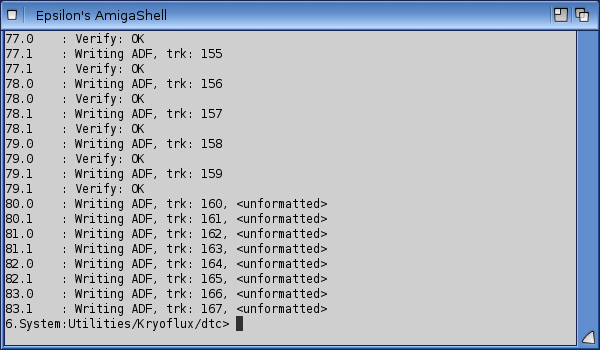 So next we need to try out some disk writing. To start with, I tried an ADF image, and then an IDF image. I copied the files I wanted to the sys:utilities/kryoflux/dtc folder and renamed them to remove spaces in the filenames.