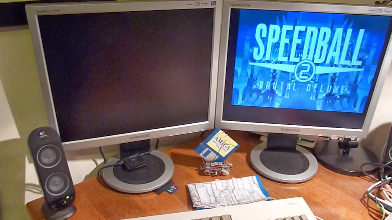 I do have a Picasso IV Zorro card, so in theory I could just use one screen if I just used that, but the PCI video card provides higher resolutions and greater colour depth, hence the dual display.