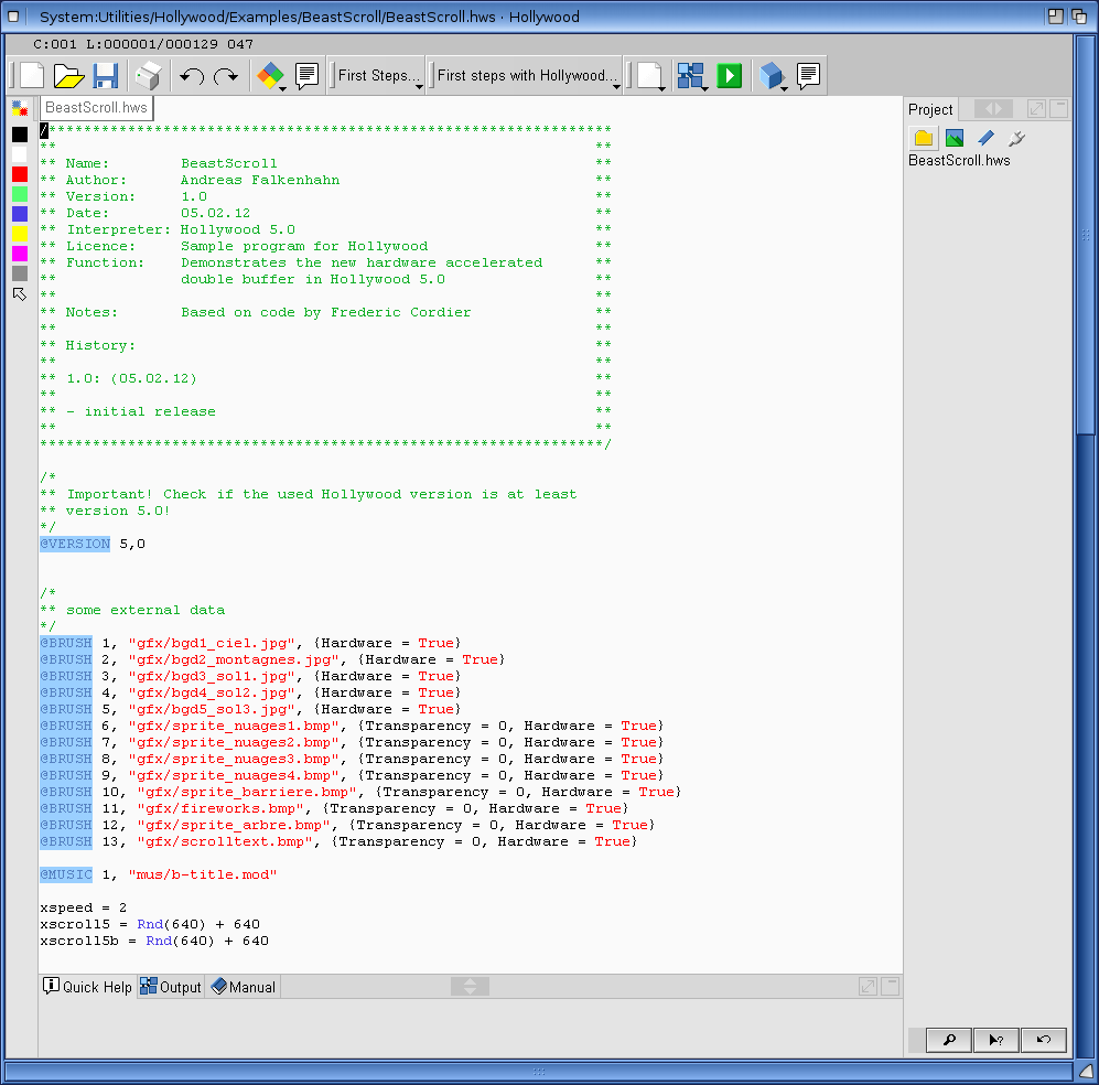 Below is Cubic IDE with the Hollywood Plugin installed - showing an example BeastScroll.hws Hollywood source code: