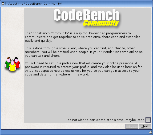 After the reboot and after launching Codebench, you can also choose to register as part of the Codebench community - basically an Instant Messaging client that allows you to chat with other developers in real time while coding:
