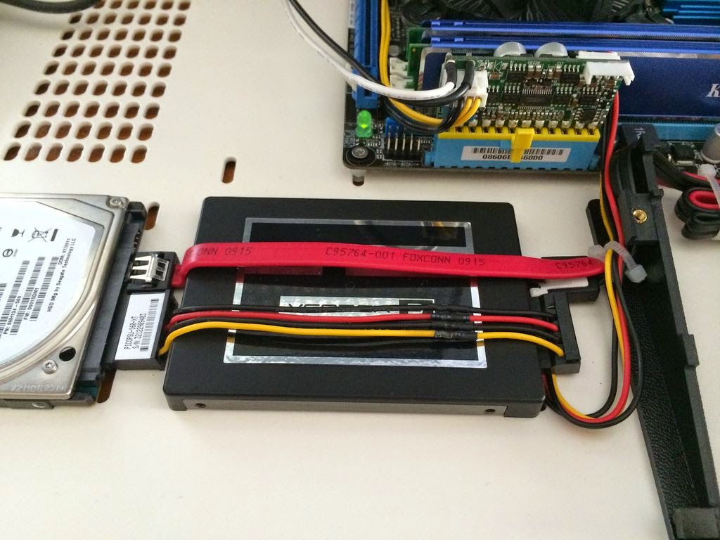 Molex connector was removed, and an extra SATA connector was attached to the wire. Ofc shrinking tubing was used to insulate the cables. After that both drives were mounted in place to check them out!