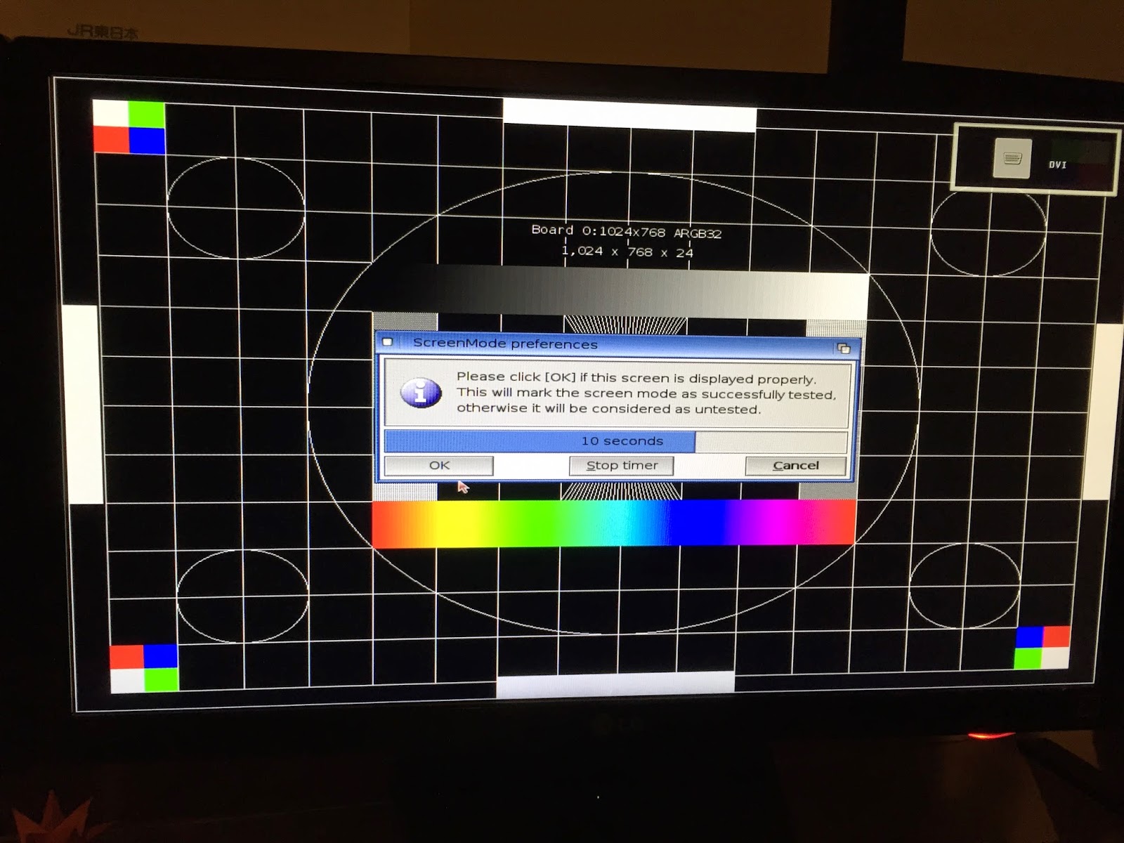 Scrolling down I note that in AmigaOS4.1 Final Edition the graphics board name has changed from Radeon R730 to Board 0. I select the 1024x768 32 bit screen mode as below: