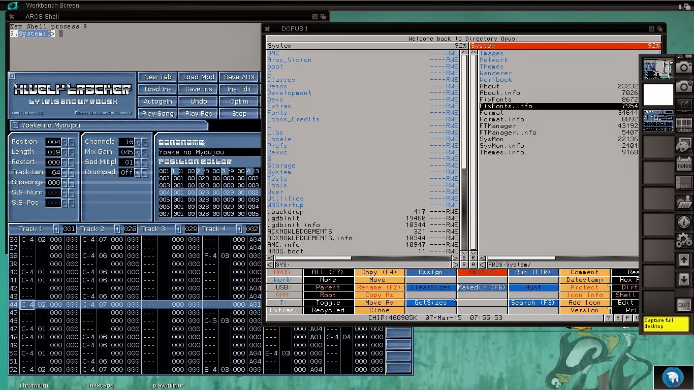 Below is some AROS applications running on AEROS - HivelyTracker, DOpus 4 and a Shell (in the background):