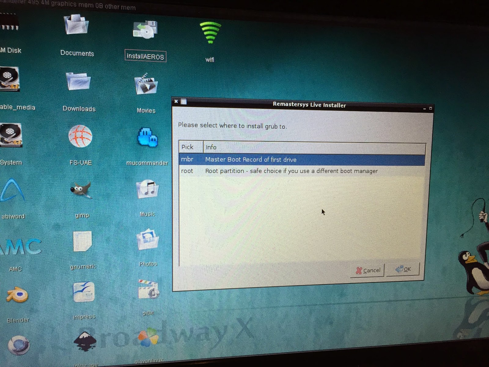 Linux uses Grub to boot itself when you turn the computer on, so it wants to know where to put it. Since I only run AEROS on this system, I select the mbr (Master Boot Record). If you run multiple OS keep in mind that you will need to edit the Grub config to dual/triple boot if you desire it: