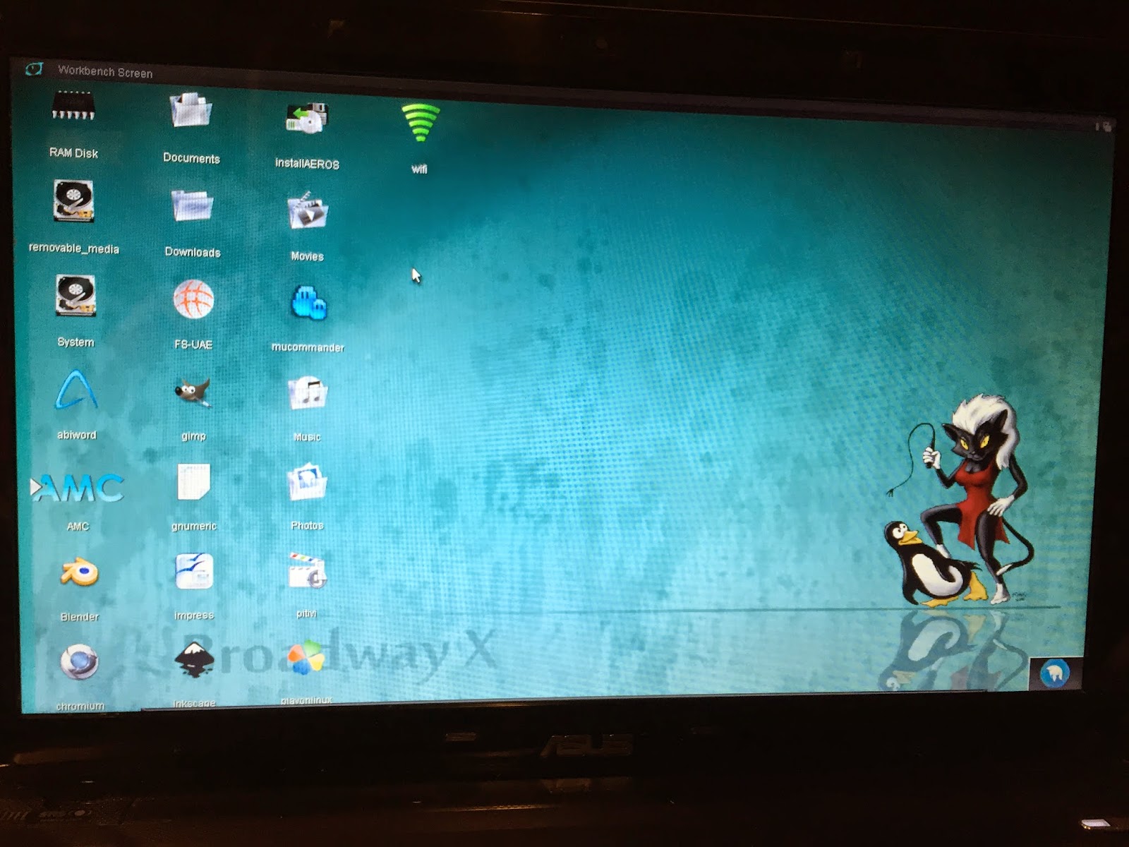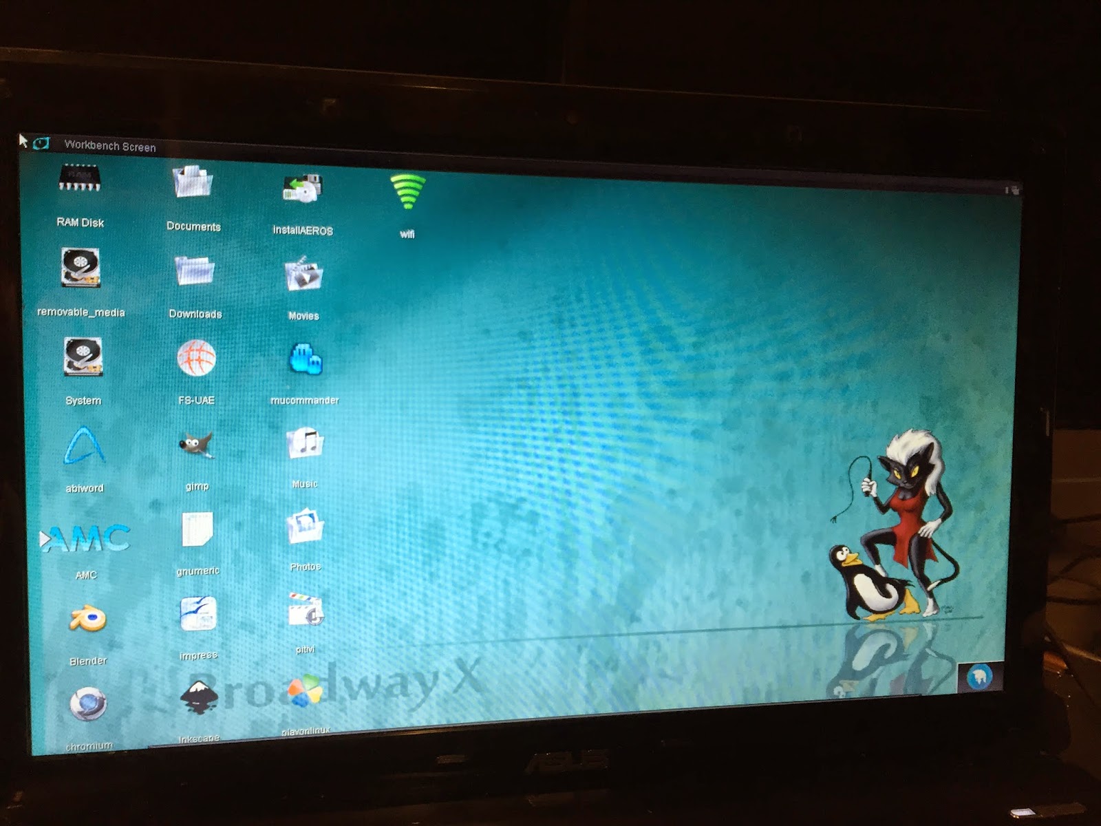 It is also evident the mixture of Linux applications and AROS ones on the AEROS Workbench itself, with some common Linux applications (Chromium, FS-UAE, GIMP, WIFI config) able to launch from the AEROS Workbench on the same screen as the AROS applications.