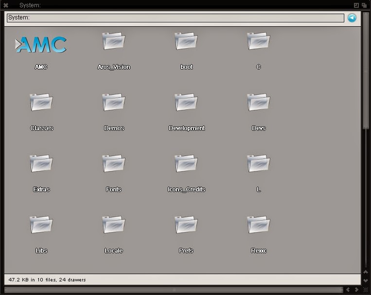 Typical Drawer layout in AEROS - here showing the System: drive - you can use the back arrow to navigate back a drawer as you navigate through the drawers and can type into the address bar manually and Press Enter to navigate to a specific location: