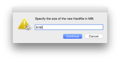 Next, it asks how large you want the disk to be. If you were planning to format the disk as FastFileSystem (FFS) then 2048 is the correct value here. In my case, I am planning to use Smart FileSystem (SFS0), which allows me to specify a much larger disk - I chose 8192MB (8GB):