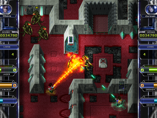 This game originally designed on the Amiga using Brilliance 2 software (see below images). Later updated using Lightwave and Photoshop (above). The game would be similar to Alien Breed or Alien Syndrome with a few twists.