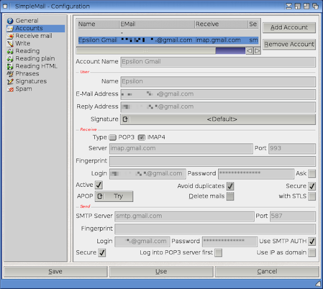Click on Add Account to start putting in the configuration. I have included the settings I used to get IMAP Gmail account working in SimpleMail - minus the pixelated email address - please substitute your own Gmail email address.