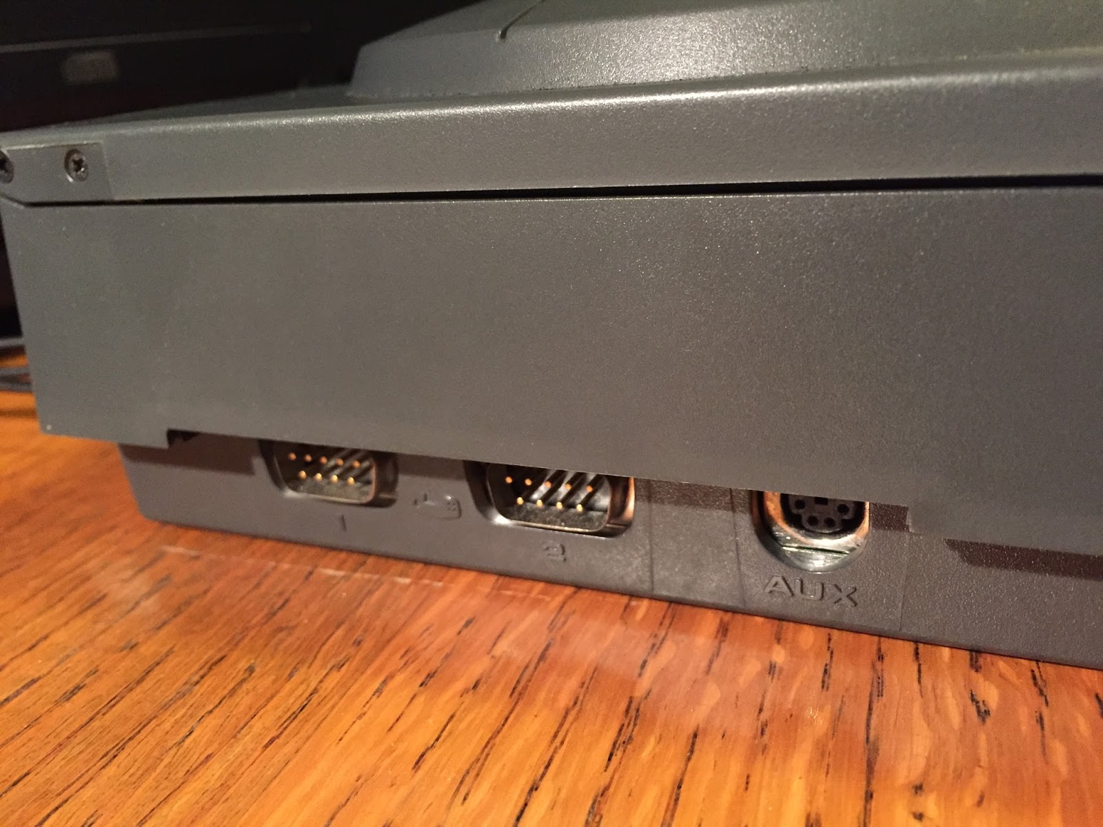 On the left side is the 2 joystick ports and an AUX port for a keyboard...