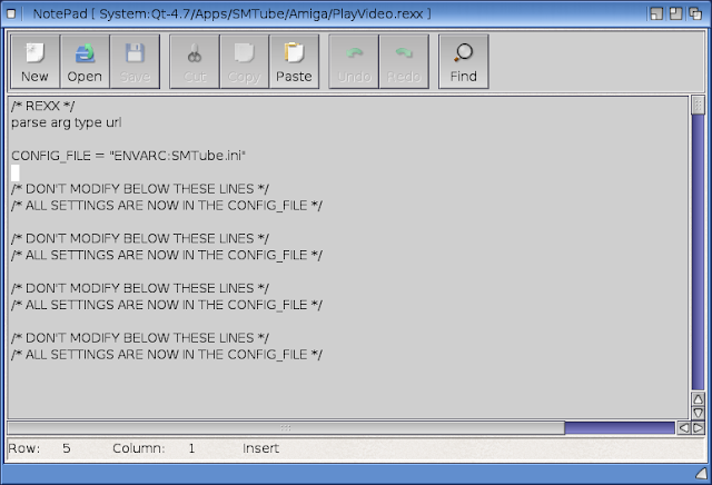 I then close SMTube so that the ENVARC:SMTube.ini file has been created. I then edit it to modify it's settings for MPlayer - this is the file before I changed it: