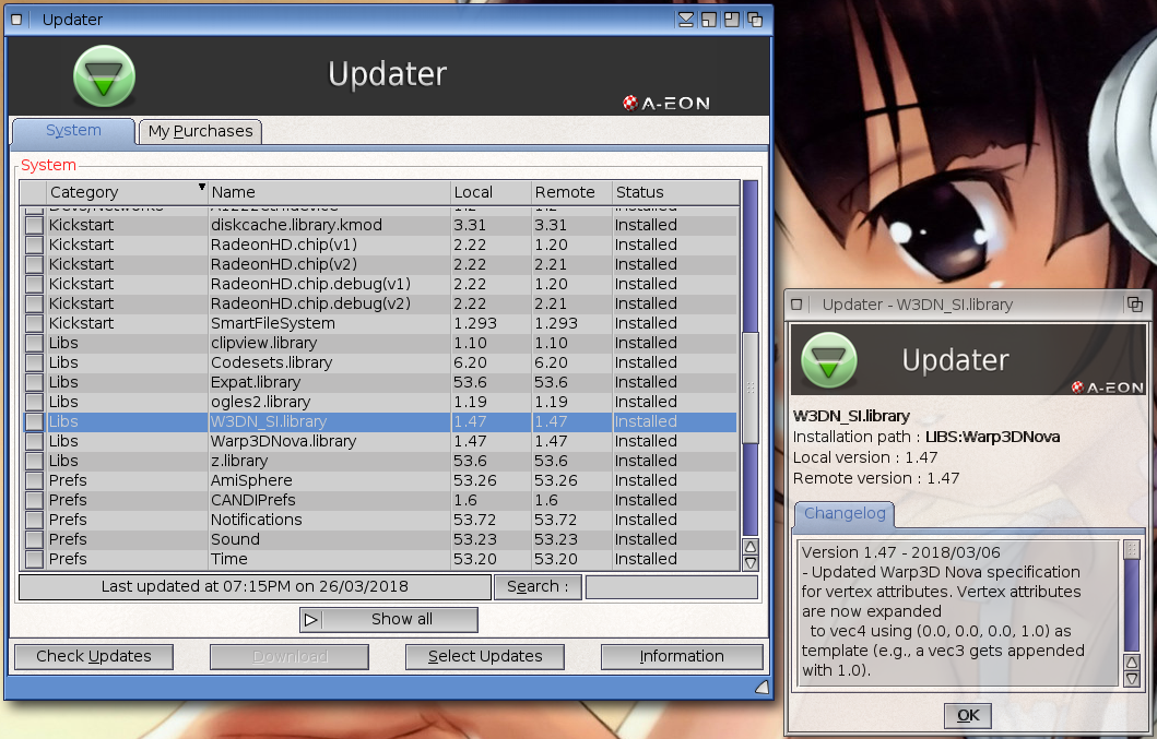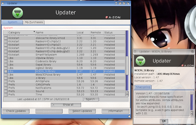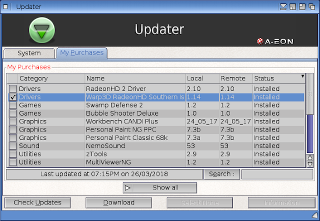 Important thing to note is that the Radeon HD and Warp3D Nova drivers are required to be installed, and updated to the latest version recently released. The easiest way to update the software is to use the Updater software, which is included with the Enhancer Plus software. If you don't have this, then updated via AMIStore.