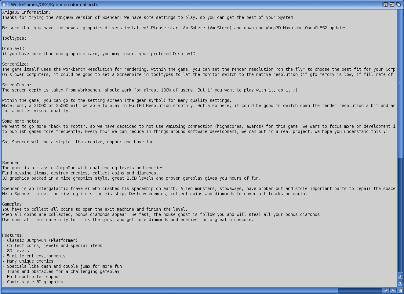 The information.txt covers the tooltypes available on the Spencer icon, and explains that the AmiBoing connection for online high scores (normally on Entwickler-X games) is not available for this game:
