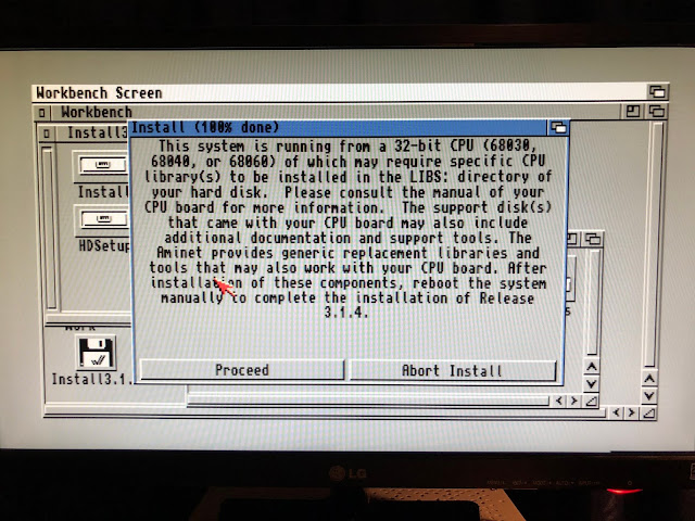 The installation warns me that it has detected an 030/040/060 CPU (from the A1200 accelerator attached to the ACA500) and I should ensure the appropriate libraries are installed for it before rebooting.