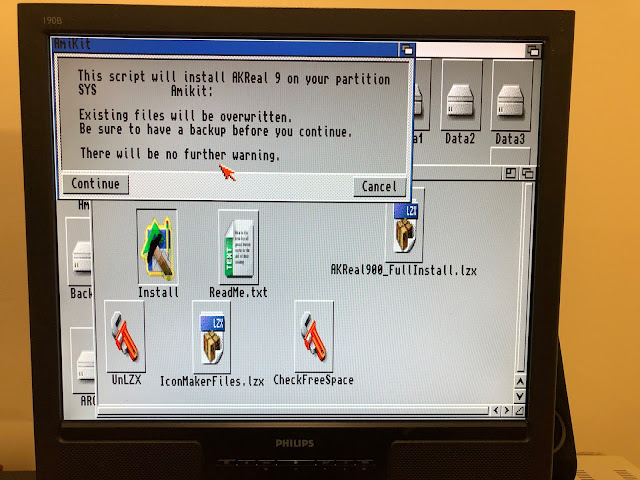 I double click on the Install icon in the AmiKit Real 9 drawer to get things underway. It warns you need to have a backup (which we have done) before we start as there is no way to stop it once it gets underway.