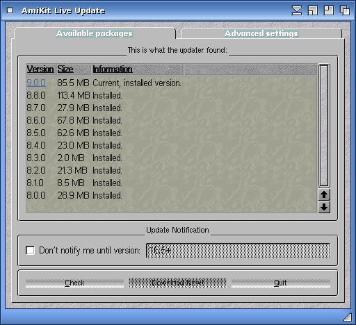 Given I am now connected to the internet on my A4000T, I took the opportunity to also run the Amikit live update software, which confirms I am running the latest version of AmiKit Real 9, with no updates to install at this time: