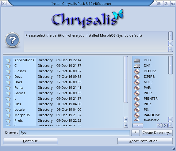 As my MorphOS 3.12 install is indeed a fresh install, I stepped through the installer for Chrysalis: