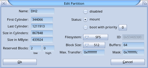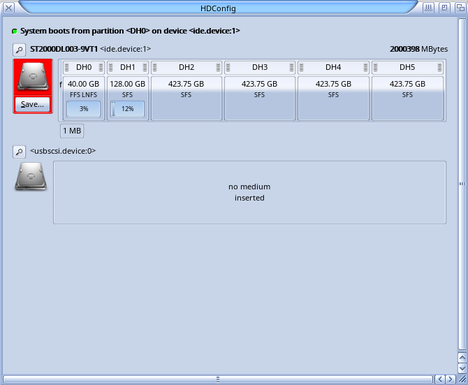With my current partition setup (setup when I installed MorphOS 3.12), HDConfig shows I have a 40GB FFS/LNFS system partition (DH0) and a 128GB SFS Work (DH1) partition. I still have a lot of free space!