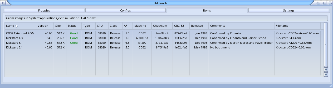 Having loaded some kickstart roms in (from my purchased Amiga forever software), I can now see them under the Roms tabs in rhLaunch: