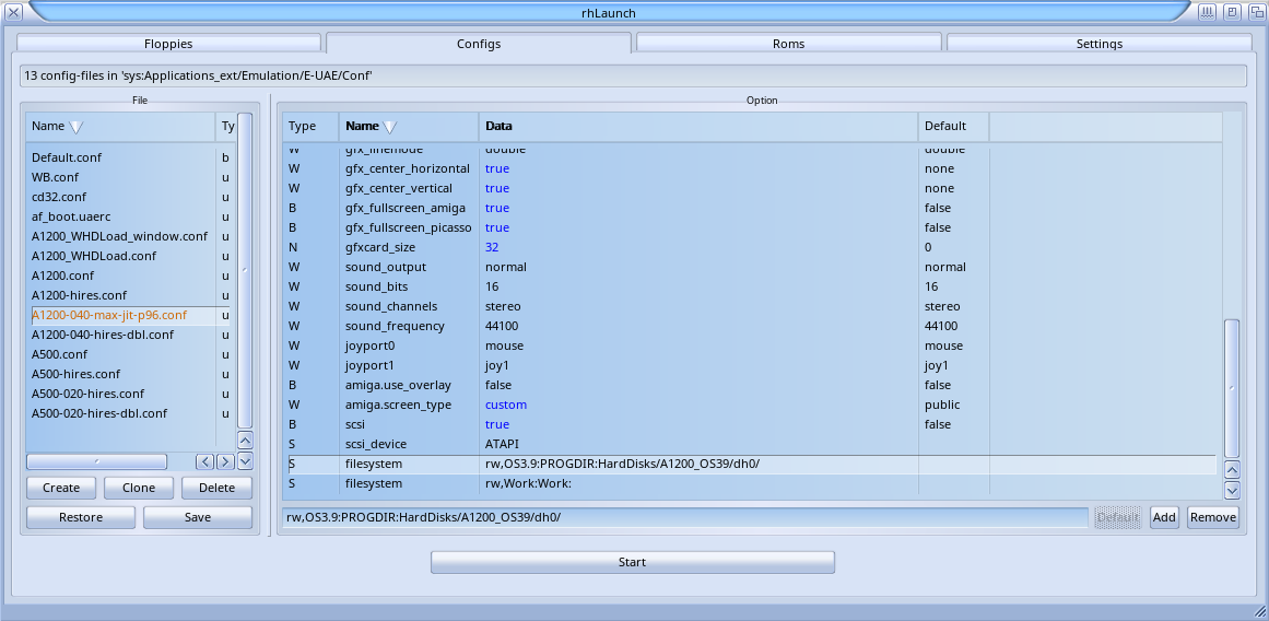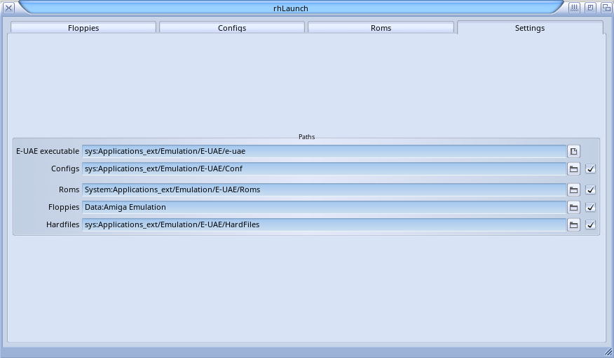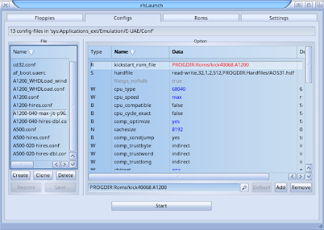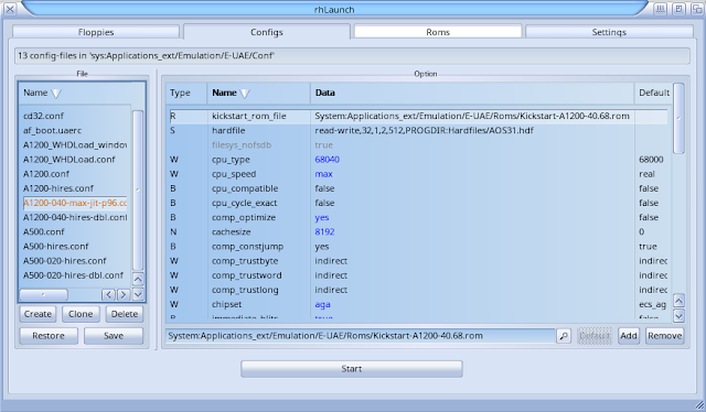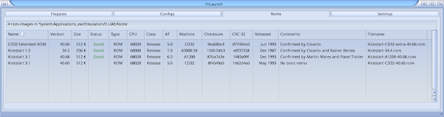 Next up is getting E-UAE working. With the Chrysalis Pack installation, it includes an almost configured E-UAE setup for MorphOS, but you do need to supply the kickstart roms (available via Cloanto's Amiga Forever) into the Roms drawer under E-UAE, and then point to it from the configuration GUI called rhLaunch under MorphOS: