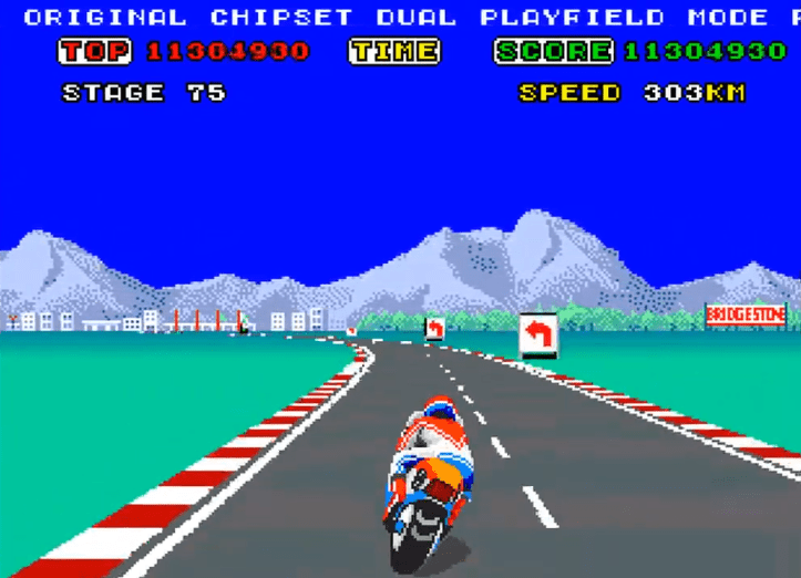 This proof of concept for arcade perfectness on the Amiga was inspired by the various not so stellar Amiga ports from back in the day. 50FPS should have been possible on the original hardware but as long as it hasn’t been implemented it doesn’t exist so there was only one way to be sure. In theory the Amiga hardware is a reasonable fit for a racing game of the era with the dual playfield mode giving good control over the race track and the objects on top. The copper can handle the race track while the blitter is busy with the objects and the CPU can orchestrate it all. Color count limitations aside it does indeed work pretty well but unfortunately there is a considerable drawback due to every single thing competing for memory bus access. The other main hurdle is the amount of chip memory needed for the graphics. Adding some real fast memory to the system helps quite a bit. The Amiga 1200, on the other hand, would be perfect for an accurate port with 16 colors per playfield as in the original and enough memory and bandwidth to support it. Perhaps a project for some other crazy MF?