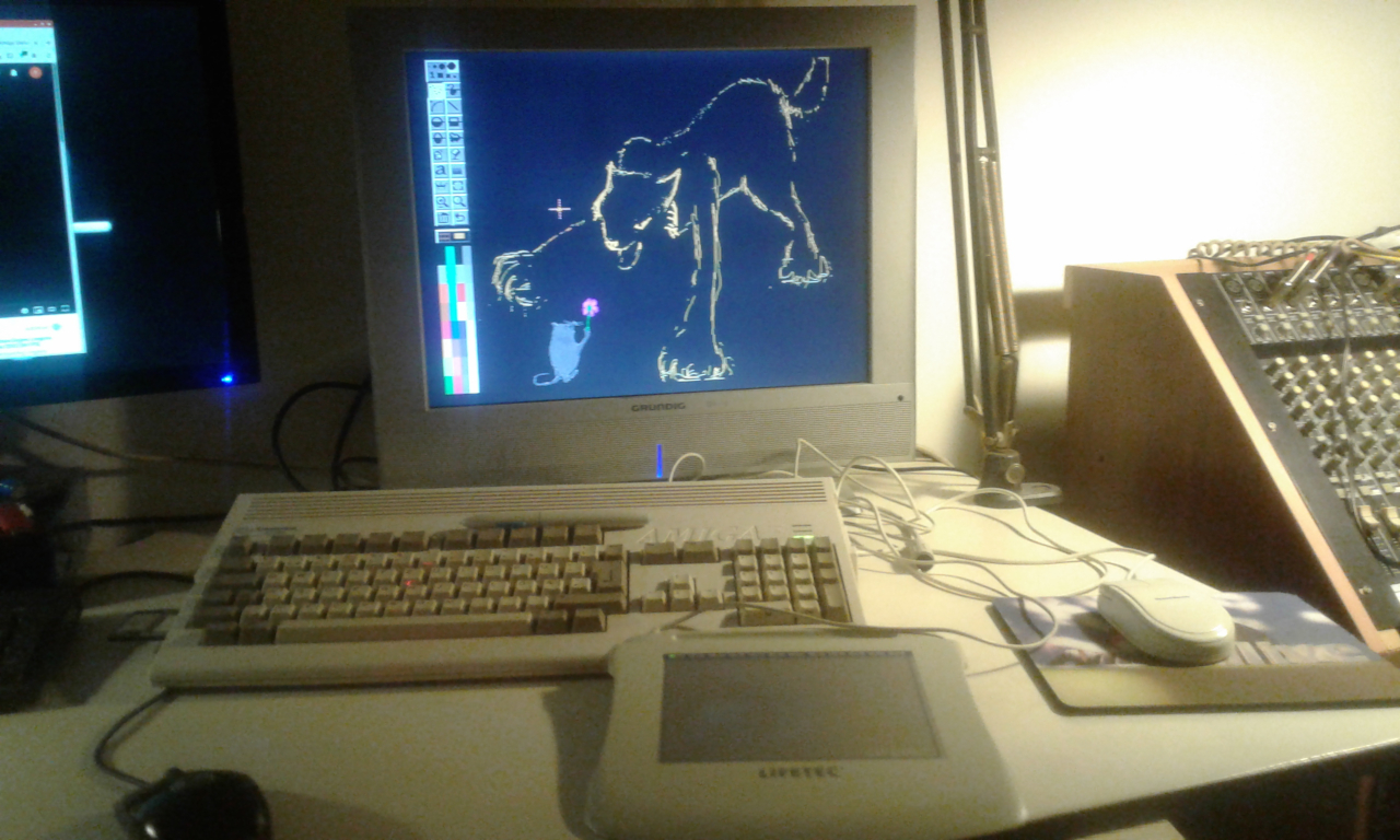 The graphics tablet is a "Lifetec" branded Tevion/Aldi LT 9310, powered by a homegrown floppy-port-PSU, and connected to the Amiga 1200's internal serial port at 19200 baud and 200lpi, using FormAldiHyd driver from AmiNet.