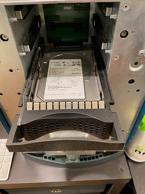 There is one SGI 73GB SCSI drive installed in the lower bay using a Drive caddy/sled. Much like servers, these are designed to be easily swappable, but it does mean locating a SGI drive caddy/sled if I want to add additional drives, which I would like to do. I'll keep an eye out for one.