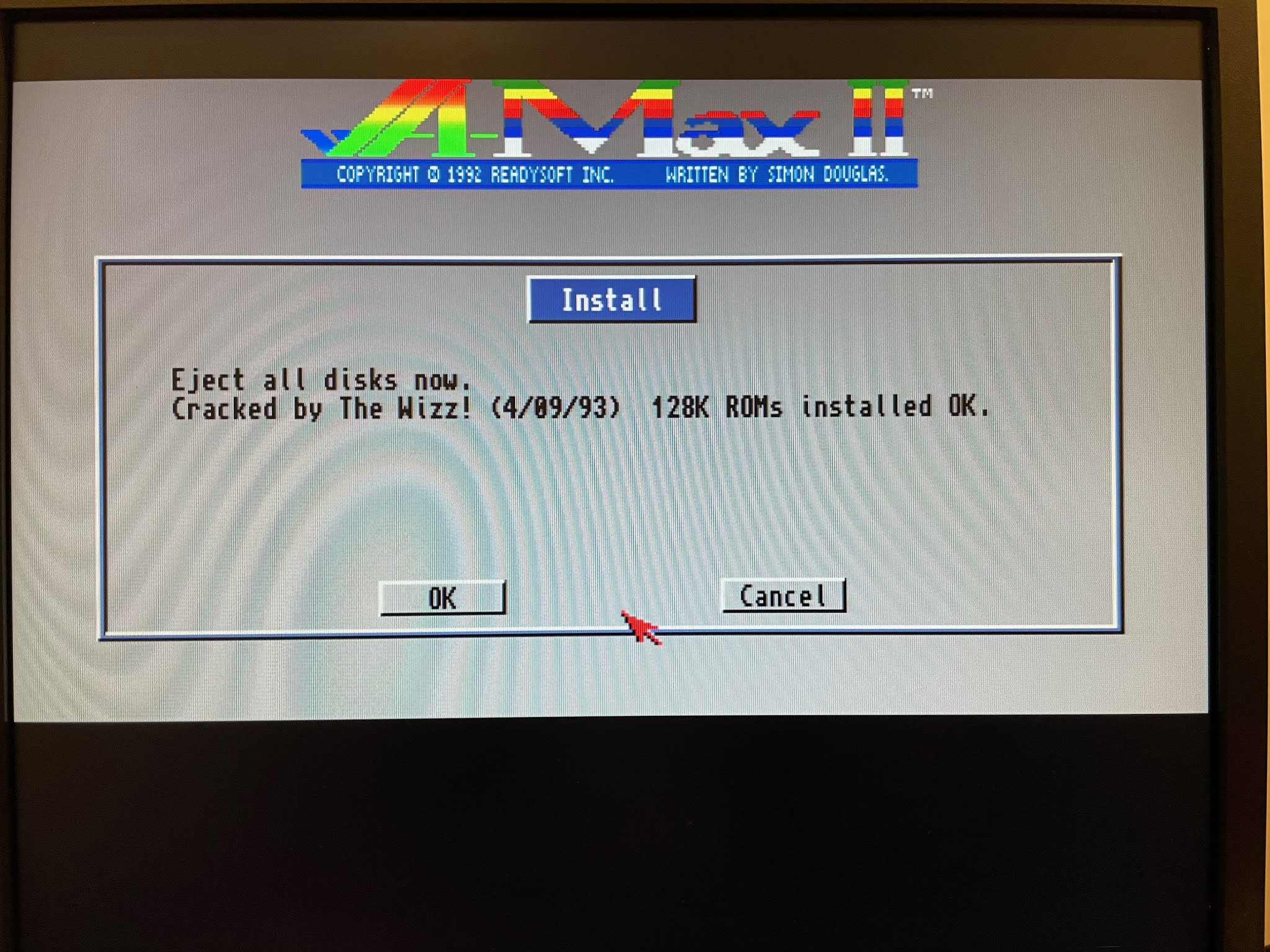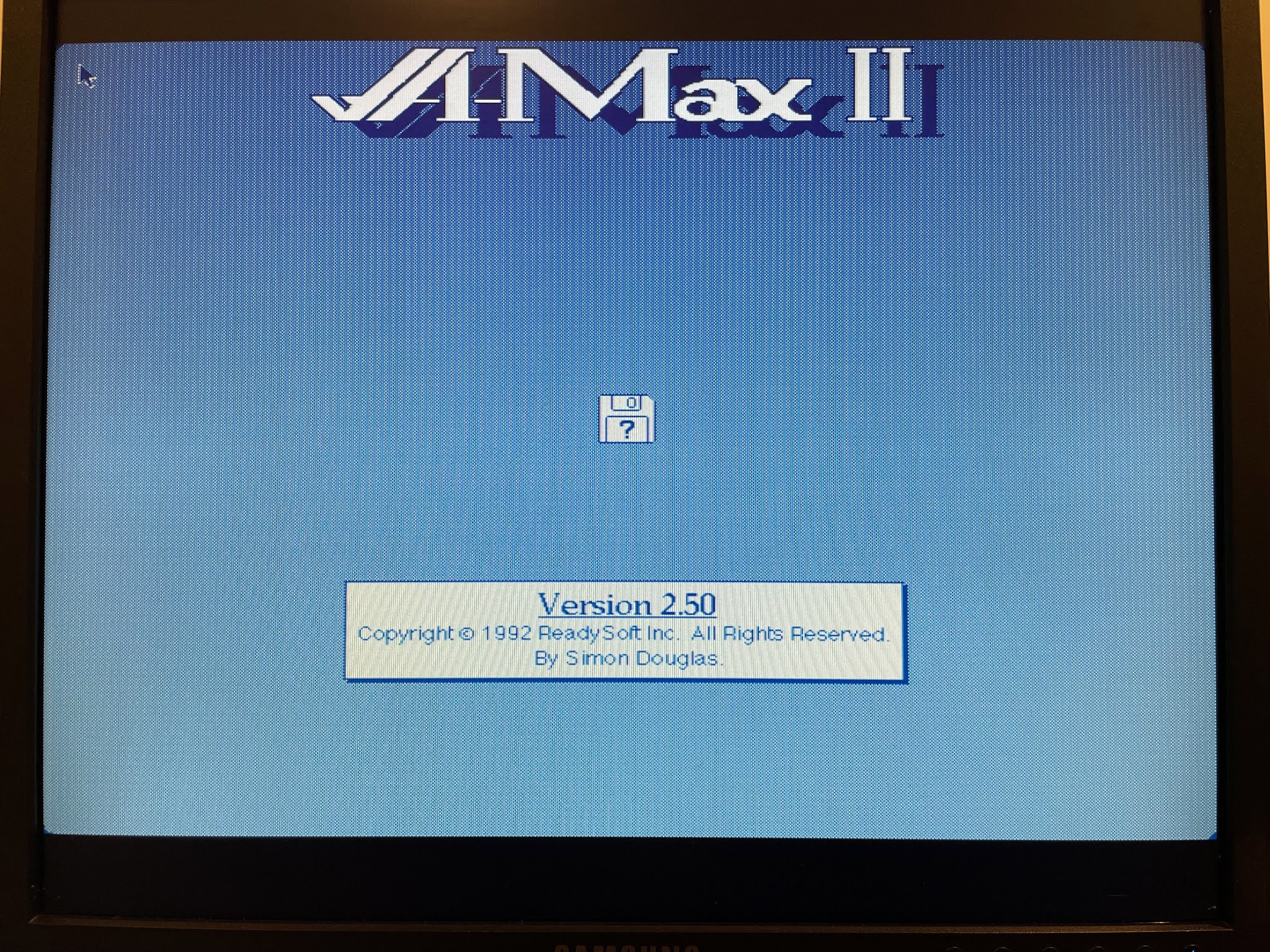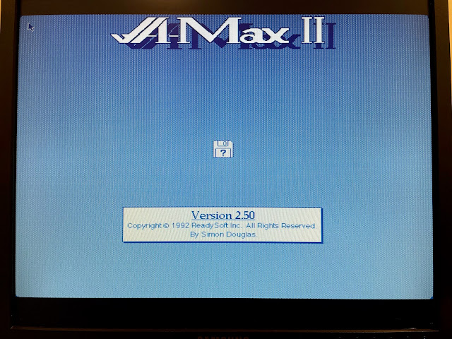 When I selected Start Amax, I get this install screen before starting. Annoyingly the floppy disk supplied on the "official site" are pirated, and cracked. I have the legit roms installed, so I didn't need this...