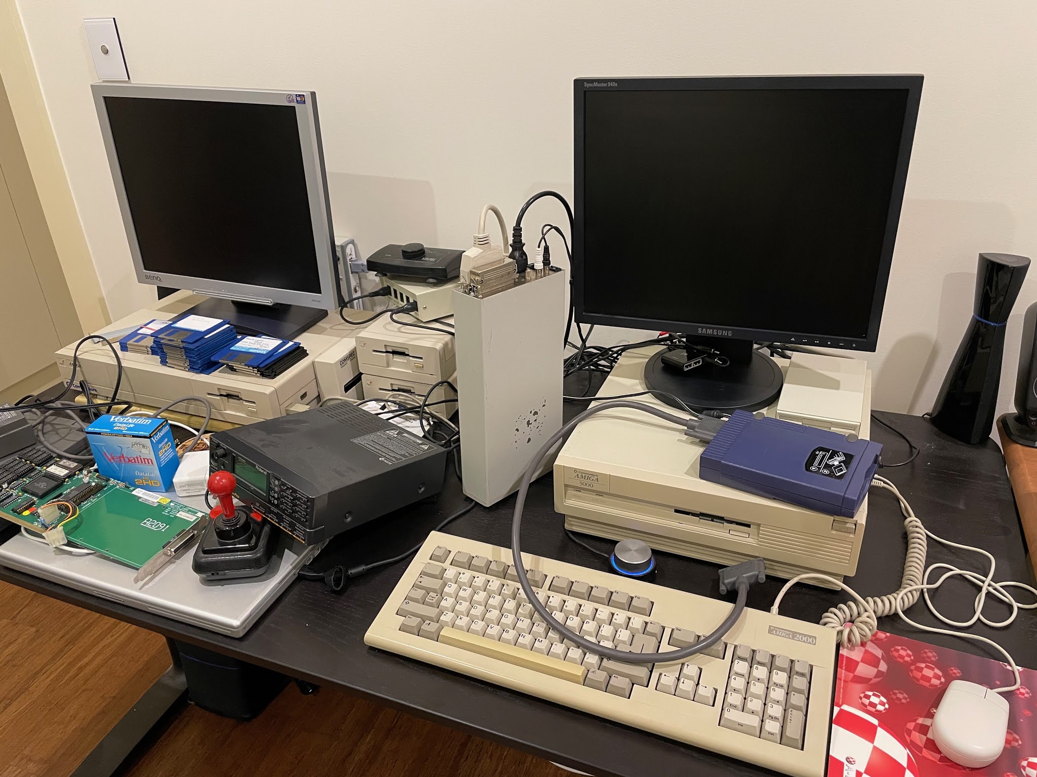 I worked it out in the end, moving the MIDI SC-88 and MIDI breakout box to the left side, and the SCSI external devices and the external floppy drive to the right side - it looks nice in my opinion!
