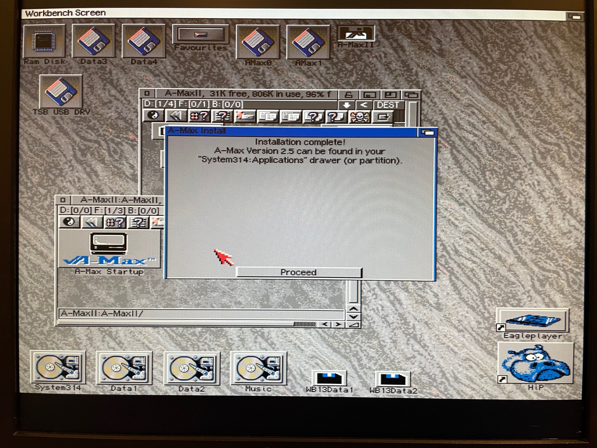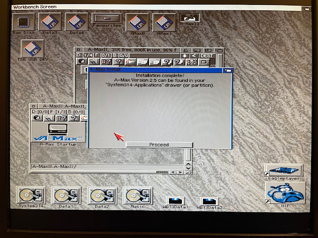 With that done, I downloaded the Amax software from the Amax site I linked above, wrote out the floppy disk images to real floppy disks and installed the software on the AmigaOS 3.1.4 hard disk: