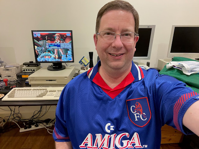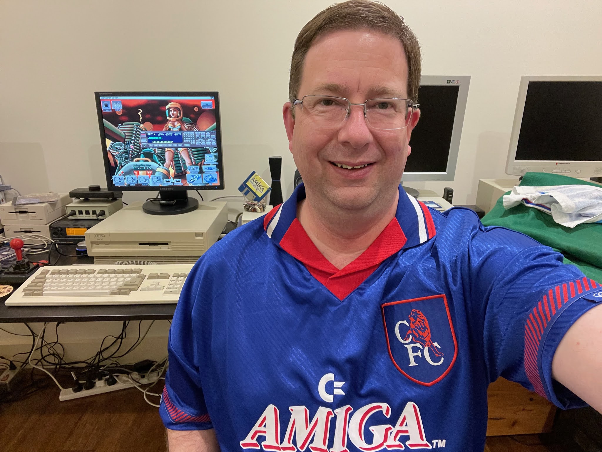 I was very proud of my build at this point, backed it up on my PC using win32 disk imager again, and decided to pose for a selfie to celebrate, wearing my new Amiga sponsored Football shirt, used by Chelsea in 1994 English Premier League season.