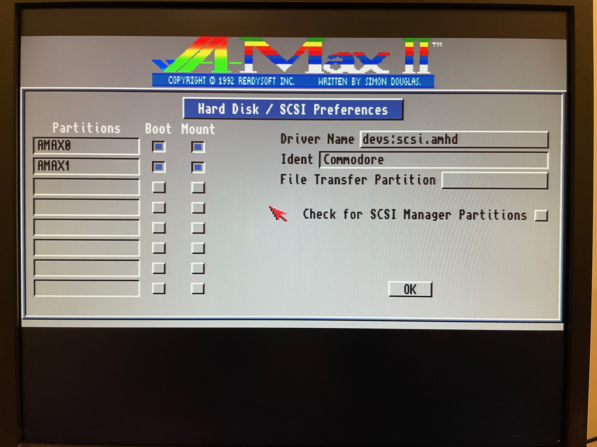 When I select the Hard Disk / SCSI preferences, you can see below it has automatically detected the correctly named AMAX0 and AMAX1 partitions, and set them as bootable and mounted: