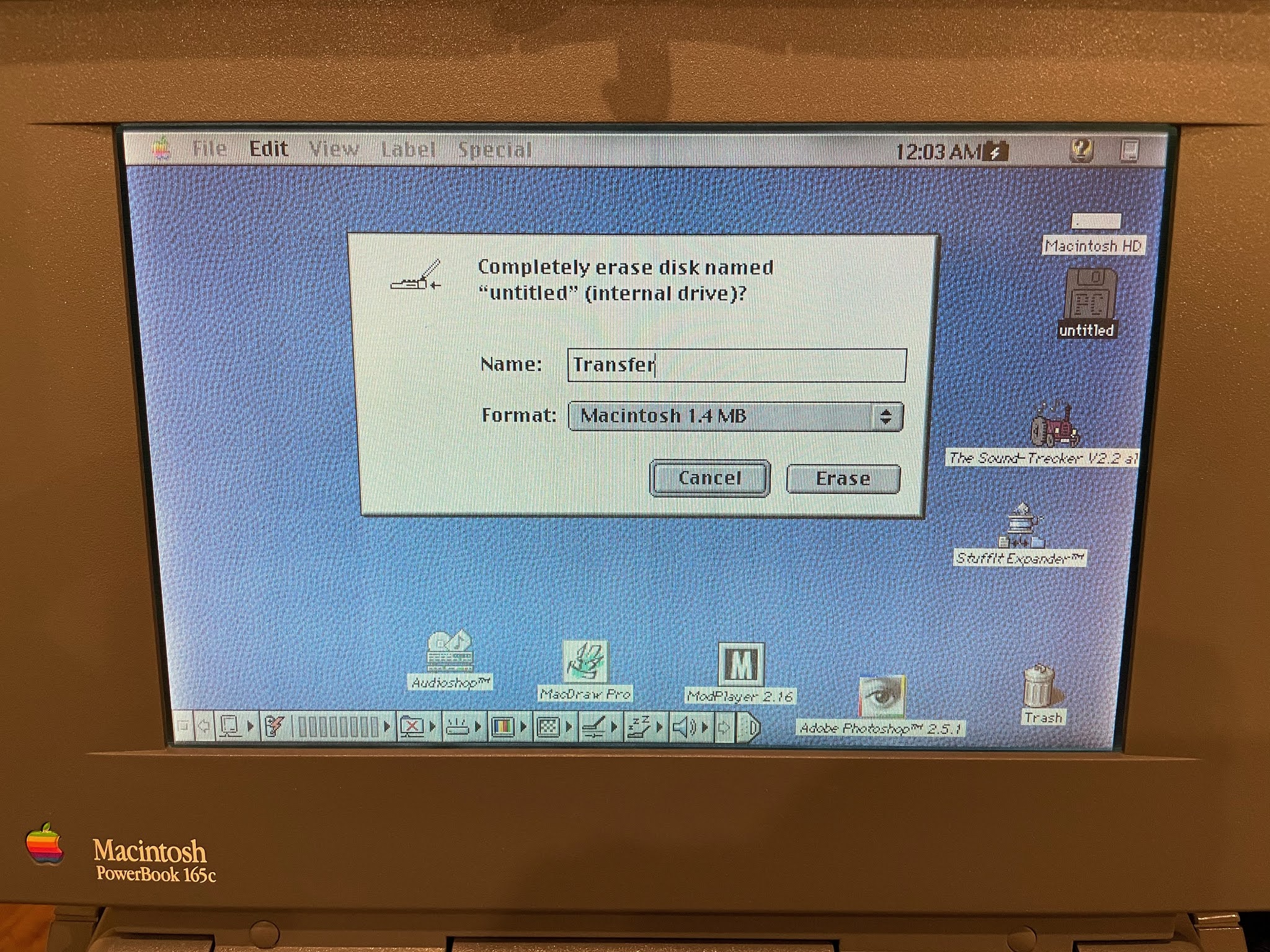 So I formatted a 1.44MB floppy disk on the Powerbook 165c first, using it's Mac floppy drive internally: