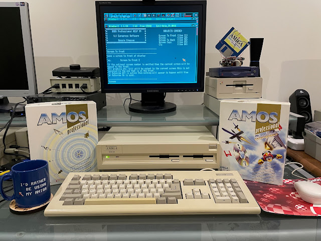 I remember buying AMOS 1.3 back in 1991, but could never afford the AMOS Compiler, AMOS 3D or AMOS Professional later on. I was glad to finally pick these up this year, and install them on my Amiga 3000, newly rebuilt this year and now working well.